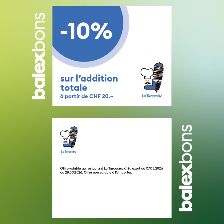 10% on the total bill from CHF 20.– Offer valid at the restaurant La Turquoise in Balexert from 07.03.2026 to 28.03.2026. Offer not valid to take away.