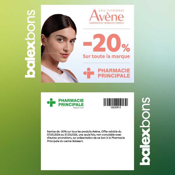 Offer valid from 07.03.2026 to 31.03.2026, only once, cannot be combined with other promotions, upon presentation of this voucher at the Main Pharmacy of the Balexert centre.