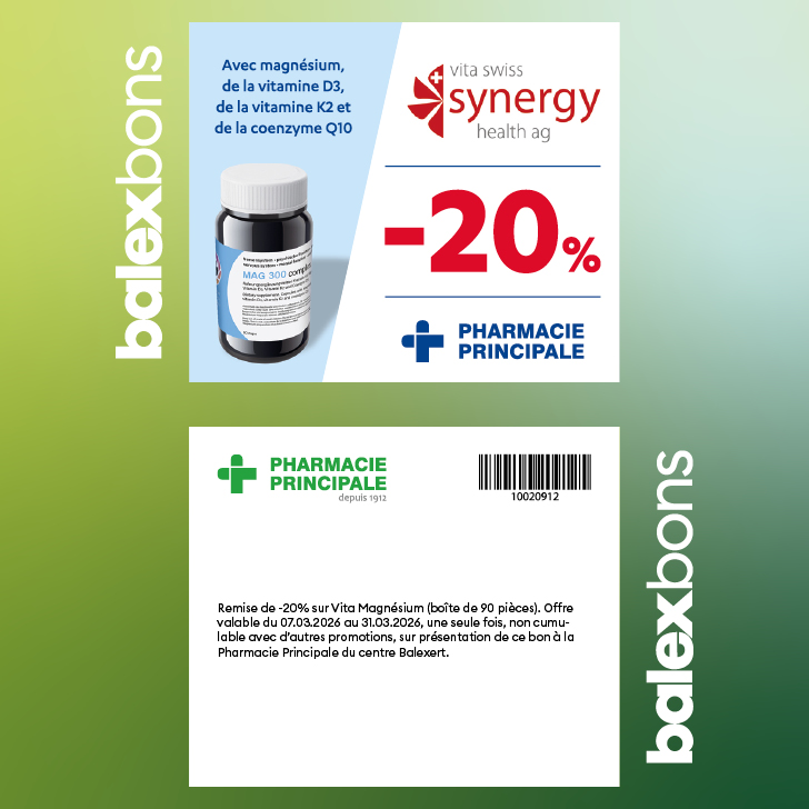 Offer valid from 07.03.2026 to 31.03.2026, only once, cannot be combined with other promotions, upon presentation of this voucher at the Main Pharmacy of the Balexert centre.