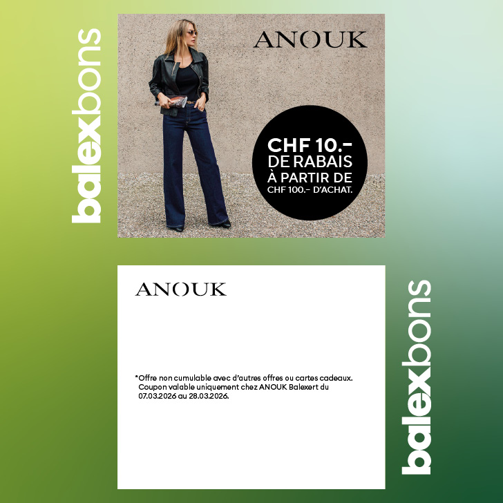 CHF 10.– DISCOUNT FROM CHF 100.– PURCHASE. Offer cannot be combined with other offers or gift cards. Coupon valid only at ANOUK Balexert from 07.03.2026 to 28.03.2026.