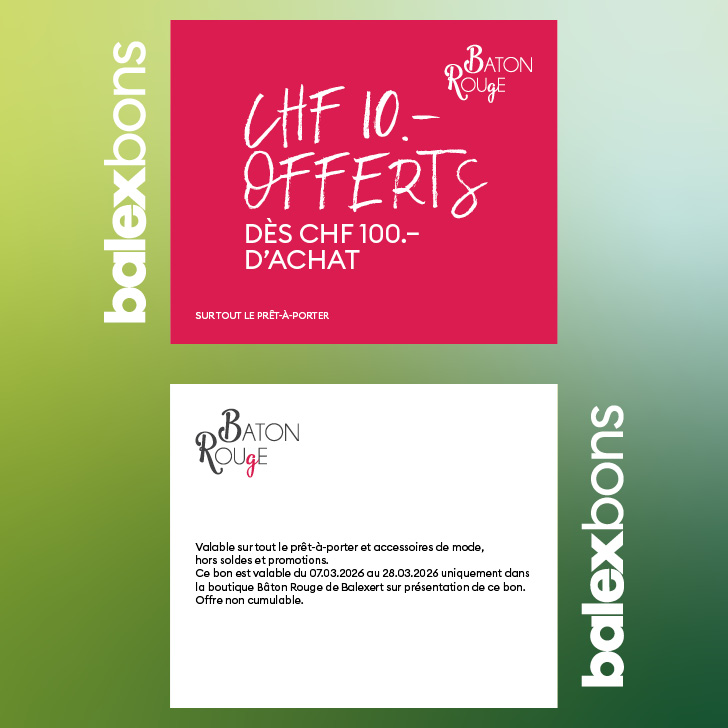 This voucher is valid from 07.03.2026 to 28.03.2026 only in the Bâton Rouge shop in Balexert upon presentation of this voucher.