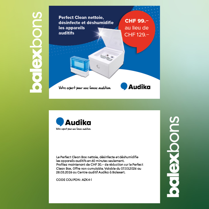 Now benefit from CHF 30.? discount on the Perfect Clean Box. Offer cannot be combined. Valid from 07.03.2026 to 28.03.2026 at the Audika Hearing Centre in Balexert.