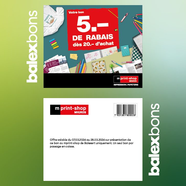 Offer valid from 7 to 28 March 2026 upon presentation of this voucher at the Balexert mprint-shop only.