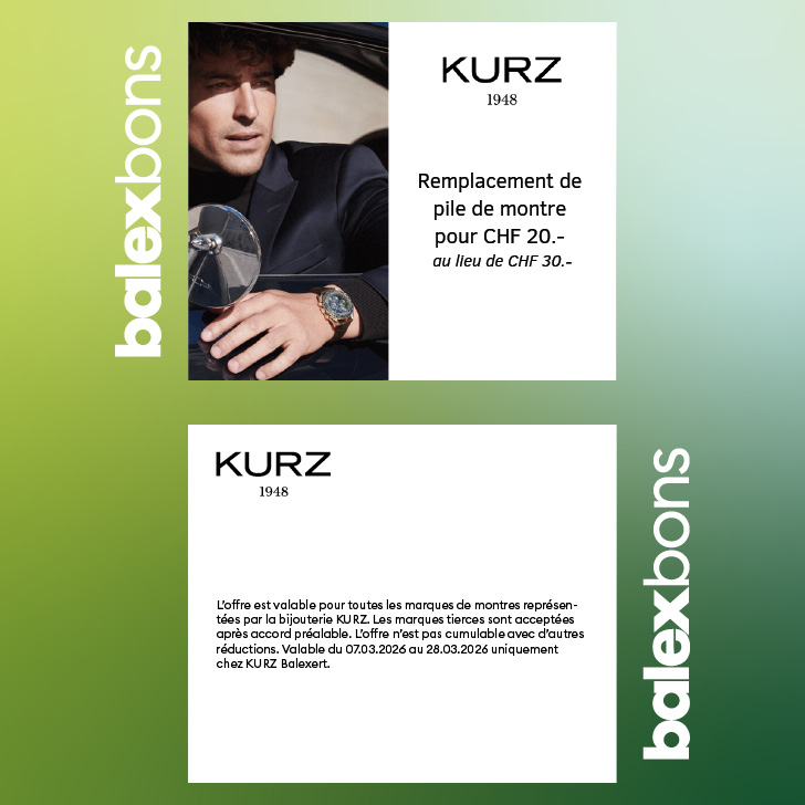 The offer is valid for all watch brands represented by KURZ Jewelry. Third-party brands are accepted by prior agreement. The offer cannot be combined with other discounts. Valid from 07.03.2026 to 28.03.2026 only at KURZ Balexert.