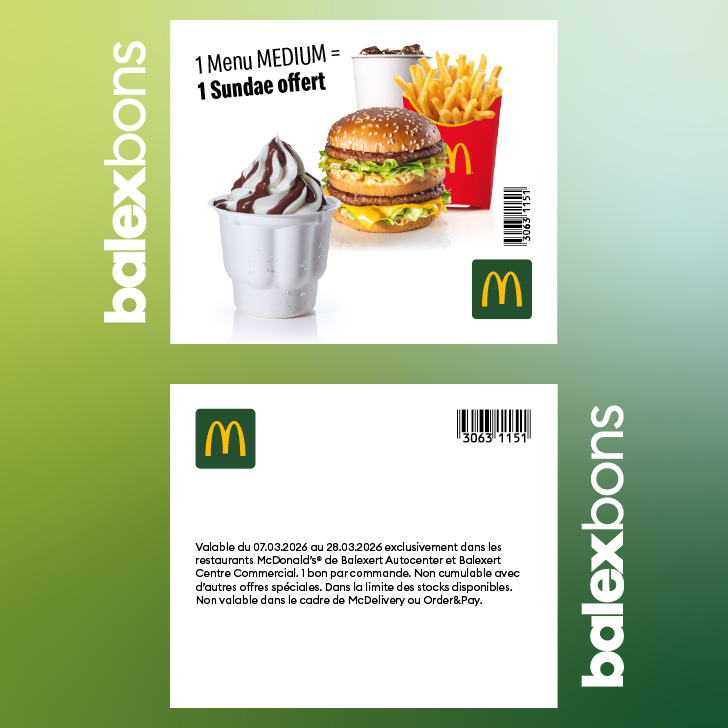 Valable du 8 au 29 mars 2025 exclusivement dans les restaurants McDonald’s® de Balexert Autocenter et Balexert Centre Commercial.