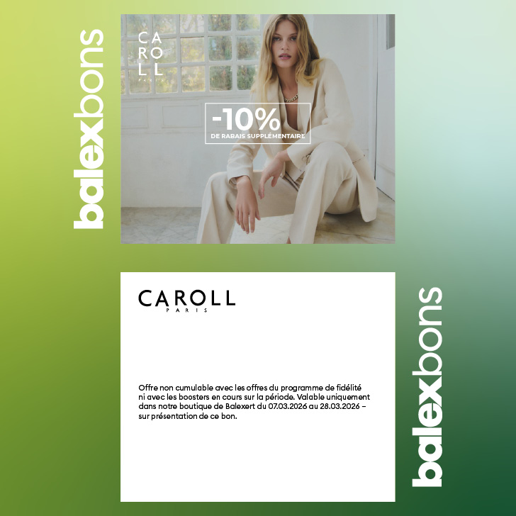 Offre non cumulable avec les offres du programme de fidélité ni avec les boosters en cours sur la période. Valable uniquement dans notre boutique de Balexert du 07.03.2026 au 28.03.2026 – sur présentation de ce bon.