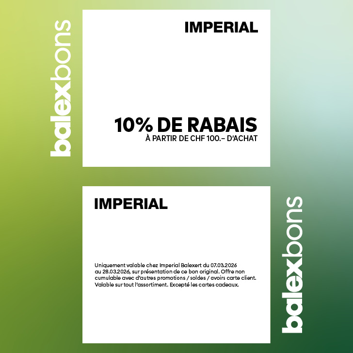 Uniquement valable chez Imperial Balexert du 07.03.2026 au 28.03.2026, sur présentation de ce bon original. Offre non cumulable avec d’autres promotions / soldes / avoirs carte client.