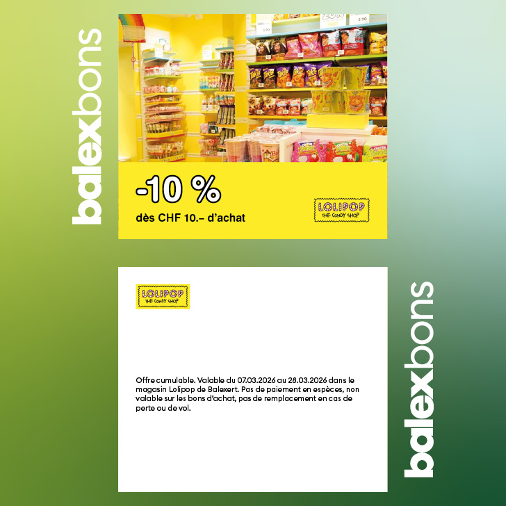 Offre cumulable. Valable du 07.03.2026 au 28.03.2026 dans le magasin Lolipop de Balexert. Pas de paiement en espèces, non valable sur les bons d’achat, pas de remplacement en cas de perte ou de vol.