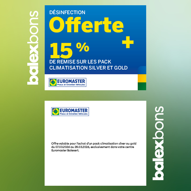 Offre valable pour l’achat d’un pack climatisation silver ou gold du 07.03.2026 au 28.03.2026, exclusivement dans votre centre Euromaster Balexert.
