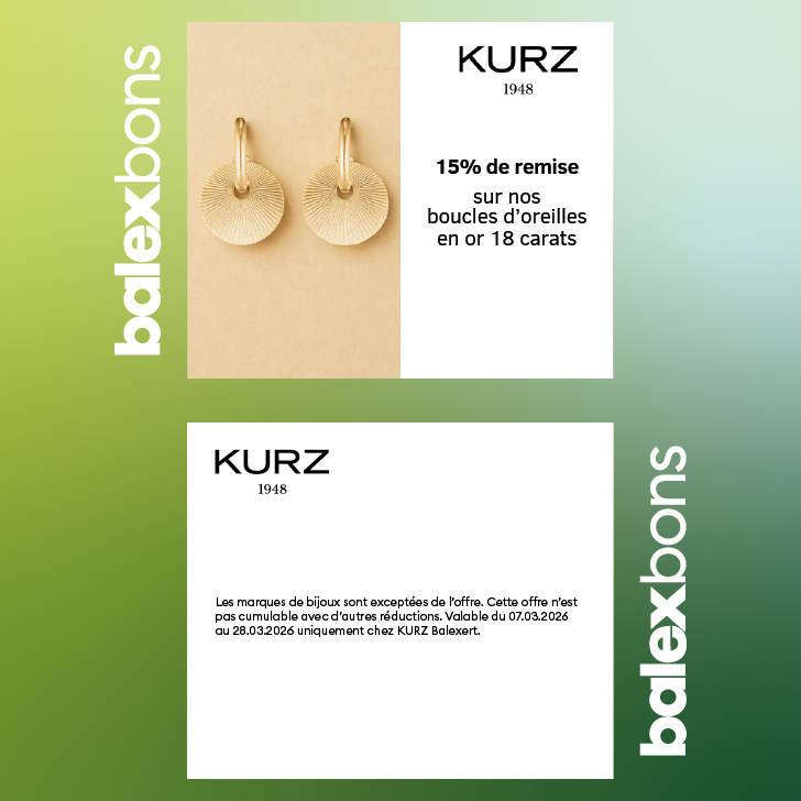 Les marques de bijoux sont exceptées de l’offre. Cette offre n’est pas cumulable avec d’autres réductions. Valable du 07.03.2026 au 28.03.2026 uniquement chez KURZ Balexert.