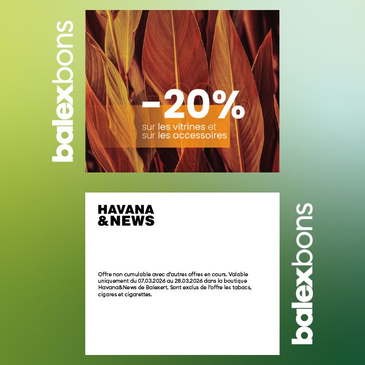 Offre non cumulable avec d’autres offres en cours. Valable uniquement du 07.03.2026 au 28.03.2026 dans la boutique Havana&News de Balexert. Sont exclus de l’offre les tabacs, cigares et cigarettes.