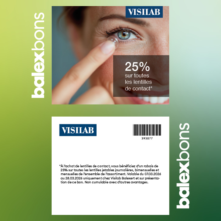 À l’achat de lentilles de contact, vous bénéficiez d’un rabais de 25% sur toutes les lentilles jetables journalières, bimensuelles et mensuelles de l’ensemble de l’assortiment. Valable du 07.03.2026 au 28.03.2026 uniquement chez Visilab Balexert et sur présentation de ce bon. Non cumulable avec d’autres avantages.