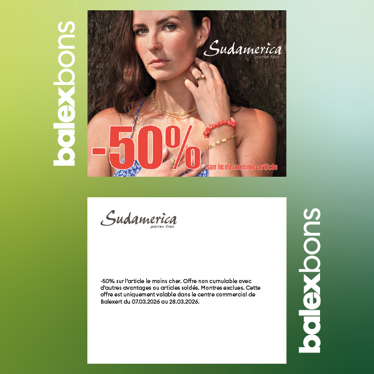 Offre non cumulable avec d’autres avantages ou articles soldés. Montres exclues. Cette offre est uniquement valable dans le centre commercial de Balexert du 07.03.2026 au 28.03.2026.