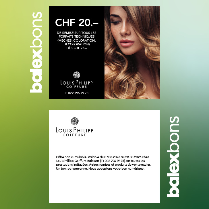 Offre non cumulable. Valable du 07.03.2026 au 28.03.2026 chez LouisPhilipp Coiffure Balexert (T : 022 796 79 78) sur toutes les prestations indiquées. Autres remises et produits de vente exclus.