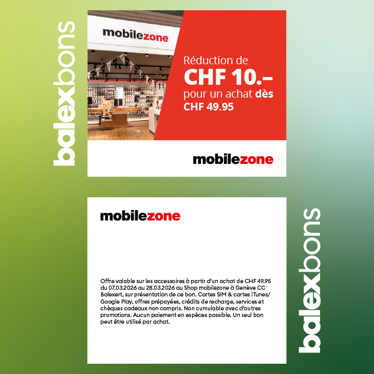 Offre valable sur les accessoires à partir d’un achat de CHF 49.95 du 07.03.2026 au 28.03.2026 au Shop mobilezone à Genève CC Balexert, sur présentation de ce bon. Cartes SIM & cartes iTunes/Google Play, offres prépayées, crédits de recharge, services et chèques cadeaux non compris. Non cumulable avec d’autres promotions. Aucun paiement en espèces possible. Un seul bon peut être utilisé par achat.