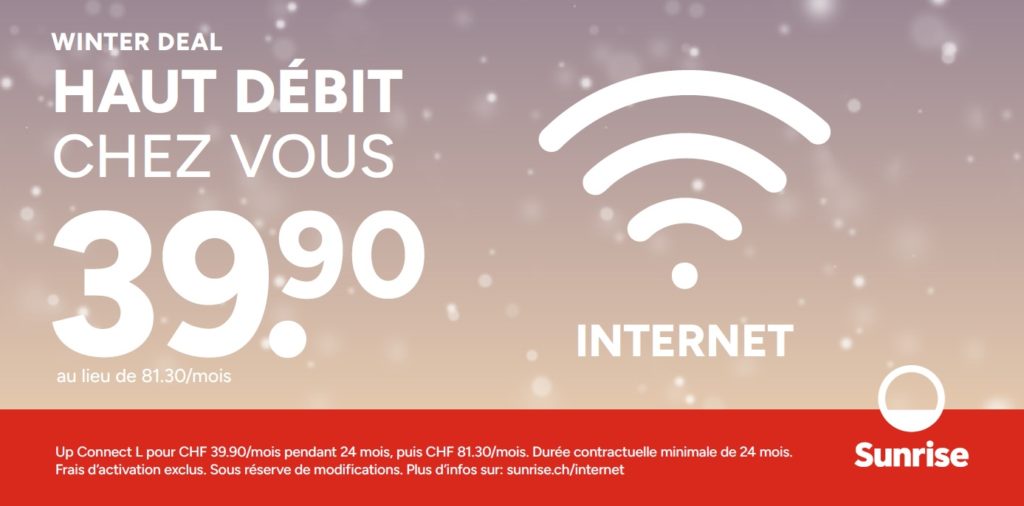 Frais d’activation exclus. Sous réserve de modifications. Plus d’infos sur: sunrise.ch/internet